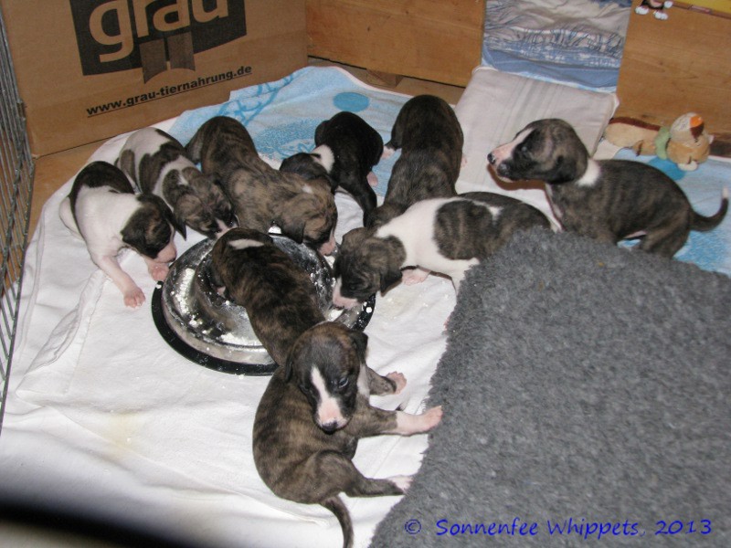 Da die Welpenkiste zu klein wurde, haben wir sie geöffnet und die Welpen haben jetzt einen kleinen Spielplatz im Wohnzimmer.