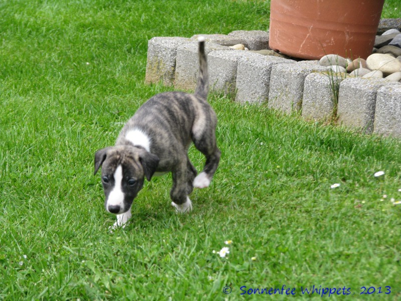 Erster Ausflug in den großen Garten mit Wiese.