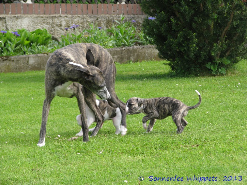 Die Welpen spielen mit Mama fangen.