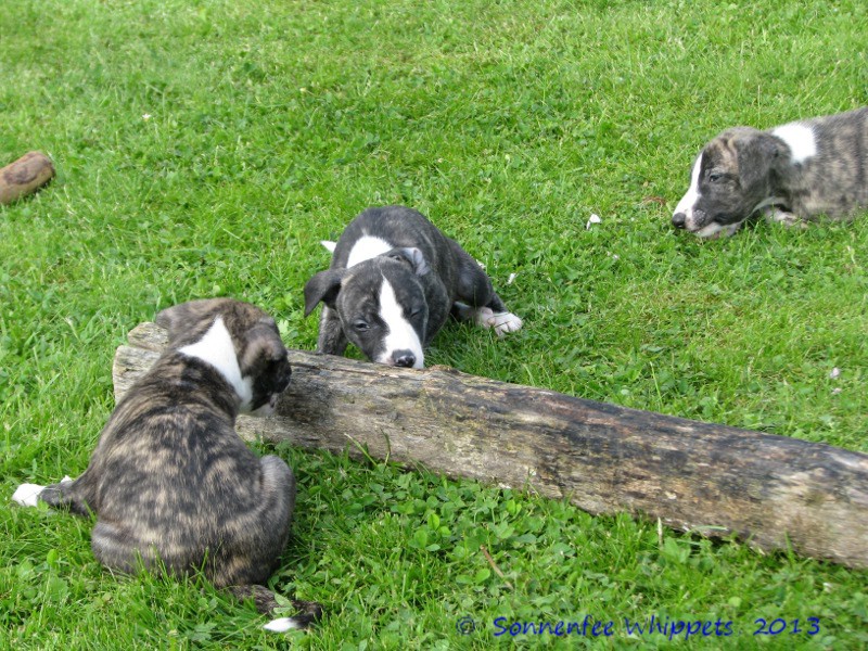 Die Welpen finden Urmels Holzsammlung sehr interessant.