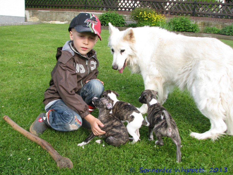 Die Hundewelpen spielen gerne mit Adrian Kowalke, sie rennen gerne hinter Adrian her.