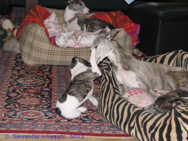 Die Welpen benehmen sich erstaunlich gut in der Wohnung. Hier spielt Dicki mit Oma Lissi, ganz süß.