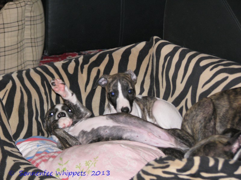Die Welpen lieben ganz offensichtlich schon den Luxus eines weichen Körbchens - ganz Whippet like.