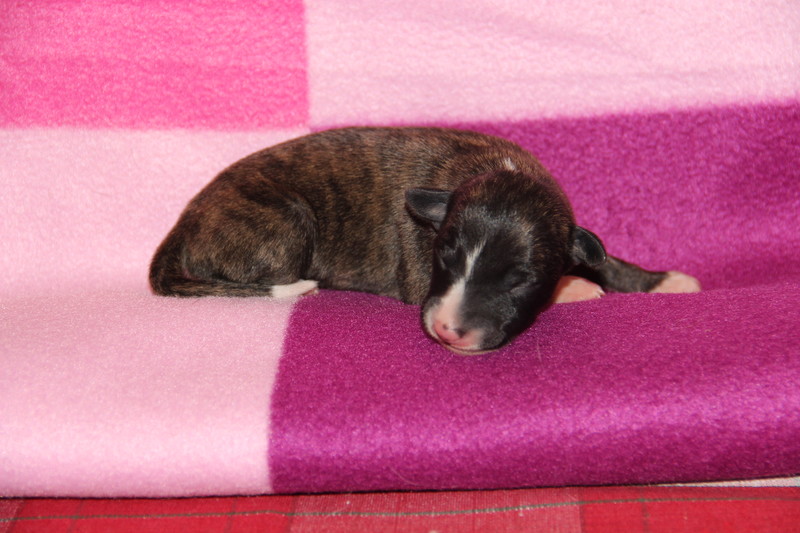 Sie ist schwarzgestromt mit winzigen weißen Abzeichen im Nacken und einer weißen Schwanzspitze.