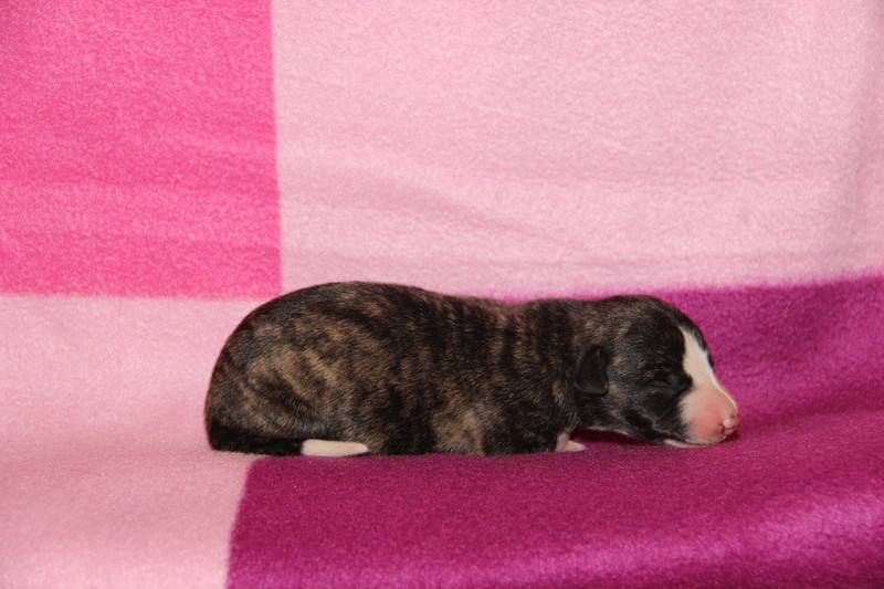 Sie ist schwarz gestromt mit einer schönen weißen Schwanzspitze.