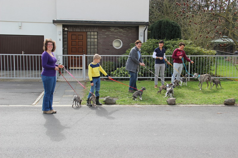 Auf dem Weg zum Bahnhof. An der Leine gehen können wir jetzt schon ganz gut.