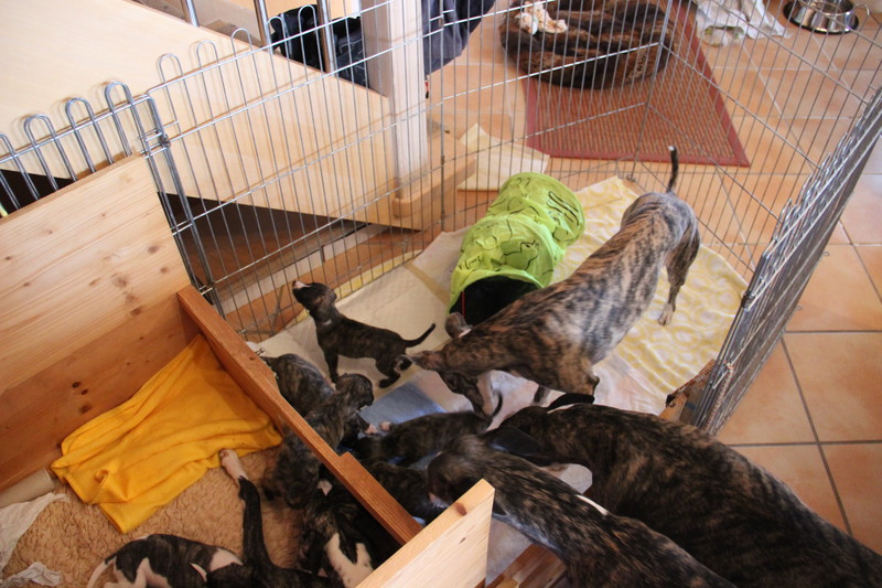 Die Welpen haben ein neues Spielzeug. Den Katzentunnel fanden sie ganz toll, weil er so schön raschelt.