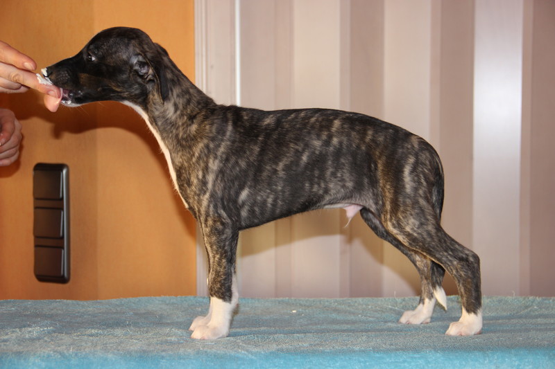 John ist ein stadtlicher eleganter Rüde, der aber sehr gemütlich ist. Hier steht er wie ein großer Whippet.