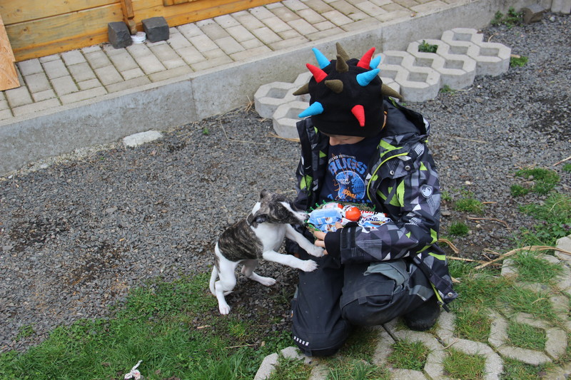 Heute Morgen ist Emma ausgebüxt und kam uns beim Eiersuchen freudestrahlend entgegen und wollte Adrian helfen.