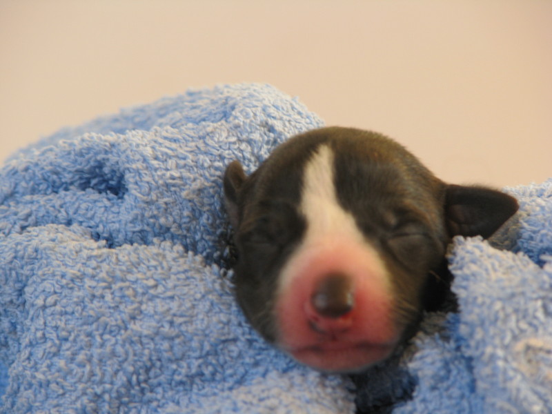 Hündin Nr. 1 Geburtsgewicht 312 gr. dunkel gestromt mit weißen Abzeichen