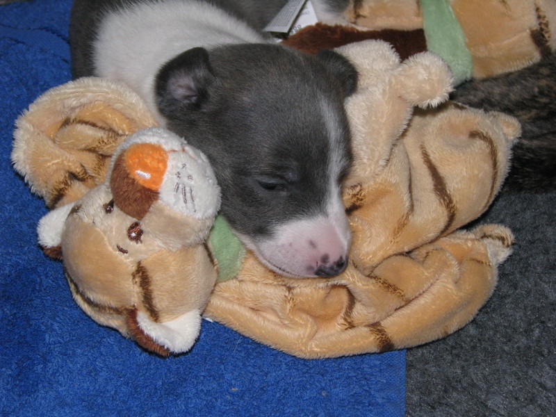 Wie die großen Whippets lieben wir kuschlige und flauschige Spieltiere und Decken. Darauf läßt es sich vortrefflich schlafen.