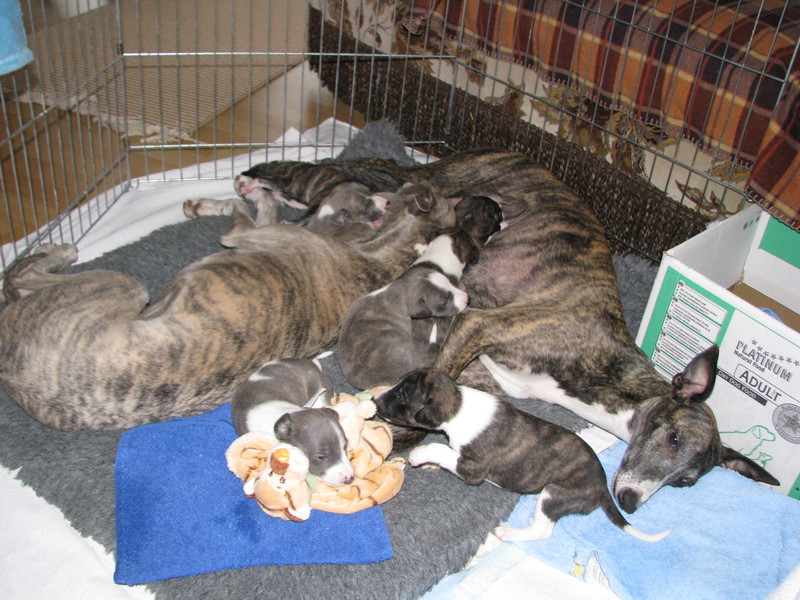 Wir freuen uns, wenn Mama Aylin und Oma Lissi zu uns in die Wurfkiste kommen, dann ist es immer sehr gemütlich. Wie unsere Mama pflegt uns auch die Oma. Sie säubert uns auch und massiert unsere kleinen Bäuche. Unsere Mama ist nicht mehr so oft bei uns, trotzdem müssen wir keinen Hunger leiden, denn wenn Essenszeit ist, kommt Aylin herbei.