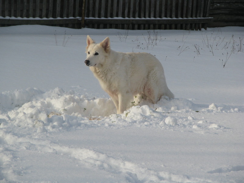 Urmel beim Graben im Schnee.