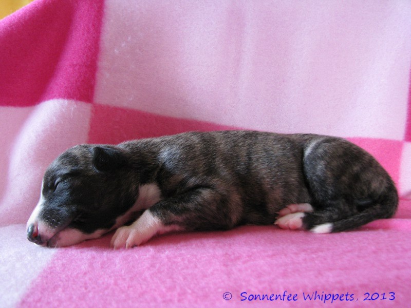 Hündin Nr. 6 ist schon sehr kräftig und geht auf wackeligen Beinen schon durch die Welpenkiste.